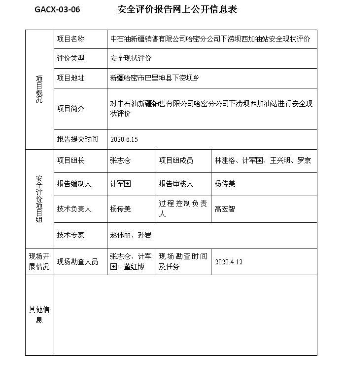 中石油新疆销售有限公司哈密分公司下涝坝西加油站安全现状评价