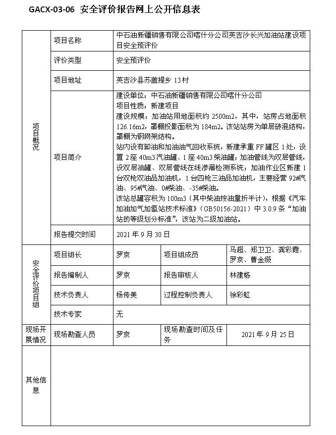 中石油新疆销售有限公司喀什分公司英吉沙长兴加油站建设项目安全预评价