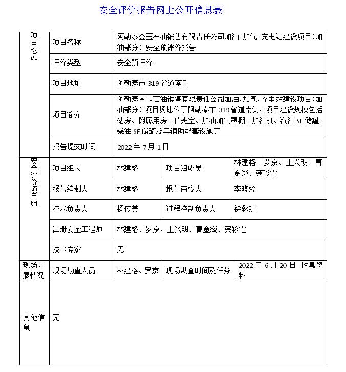 阿勒泰金玉石油销售有限责任公司加油、加气、充电站建设项目(加油部分)安全预评价报告