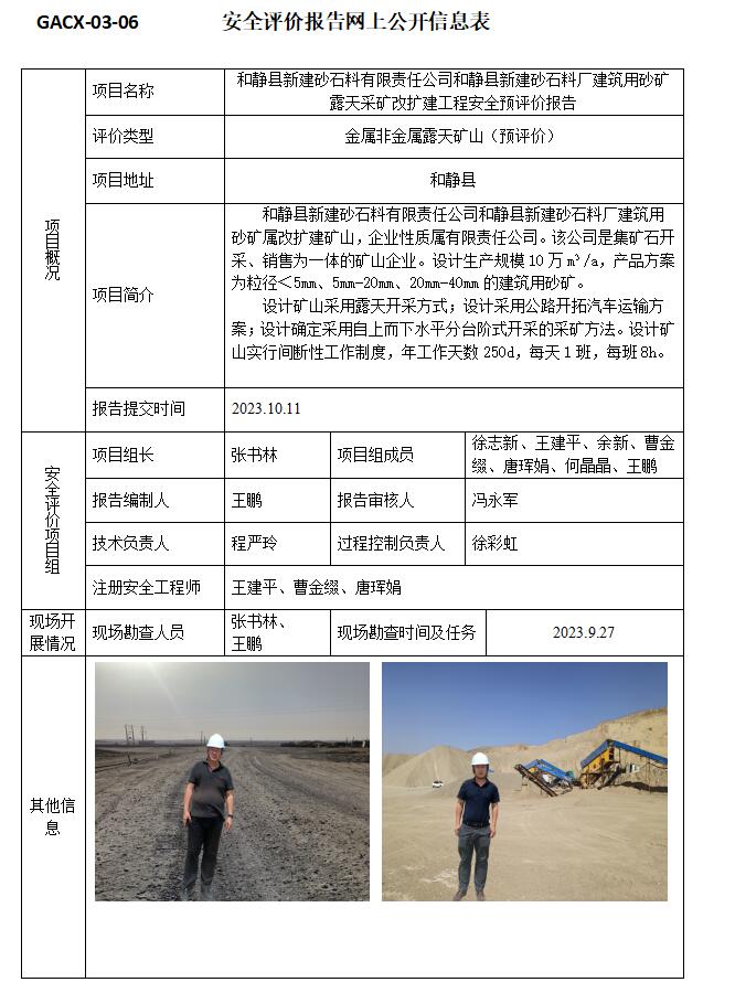 和静县新建砂石料有限责任公司和静县新建砂石料厂建筑用砂矿露天采矿改扩建工程安全预评价报告