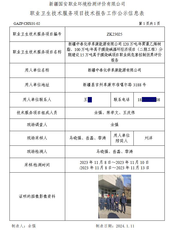 新疆中泰化学阜康能源有限公司120万吨 年聚氯乙烯树脂、100万吨 年离子膜烧碱循环经济项目(二期工程)分期建设15万吨离子膜烧碱项目职业病危害控制效果评价报告