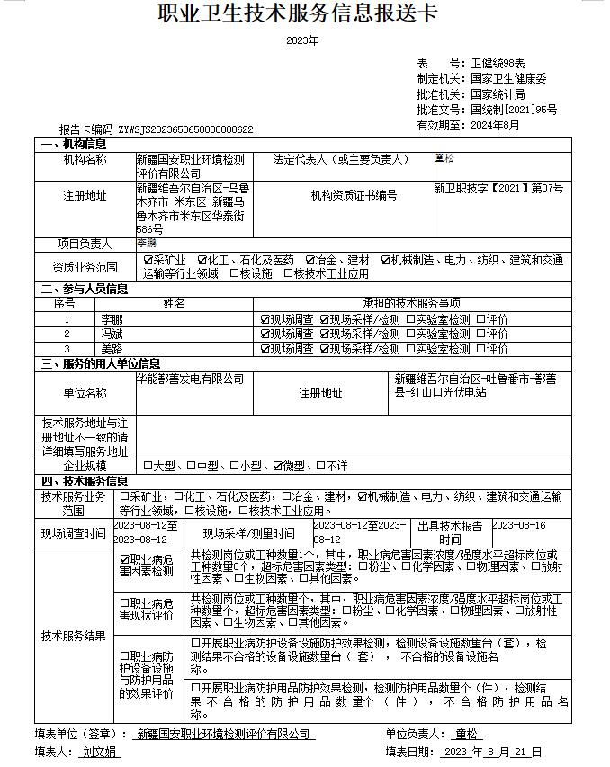 焉耆华能光伏发电有限责任公司职业病危害因素检测