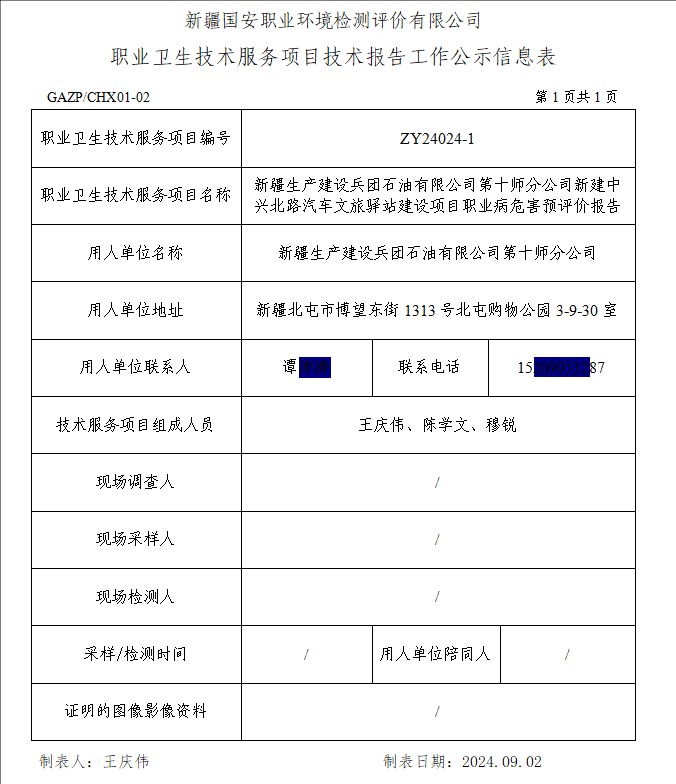 新疆生产建设兵团石油有限公司第十师分公司新建中兴北路汽车文旅驿站建设项目职业病危害预评价报告