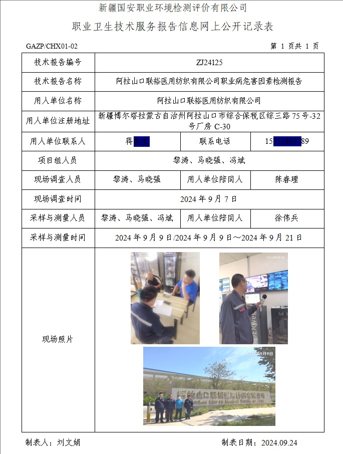 阿拉山口联裕医用纺织有限公司职业病危害因素检测报告