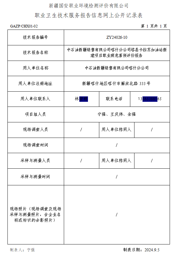 中石油新疆销售有限公司喀什分公司塔县卡拉苏加油站新建项目职业病危害预评价报告