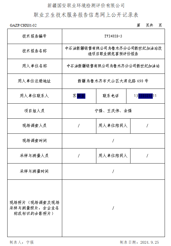 中石油新疆销售有限公司乌鲁木齐分公司新世纪加油站改造项目职业病危害预评价报告