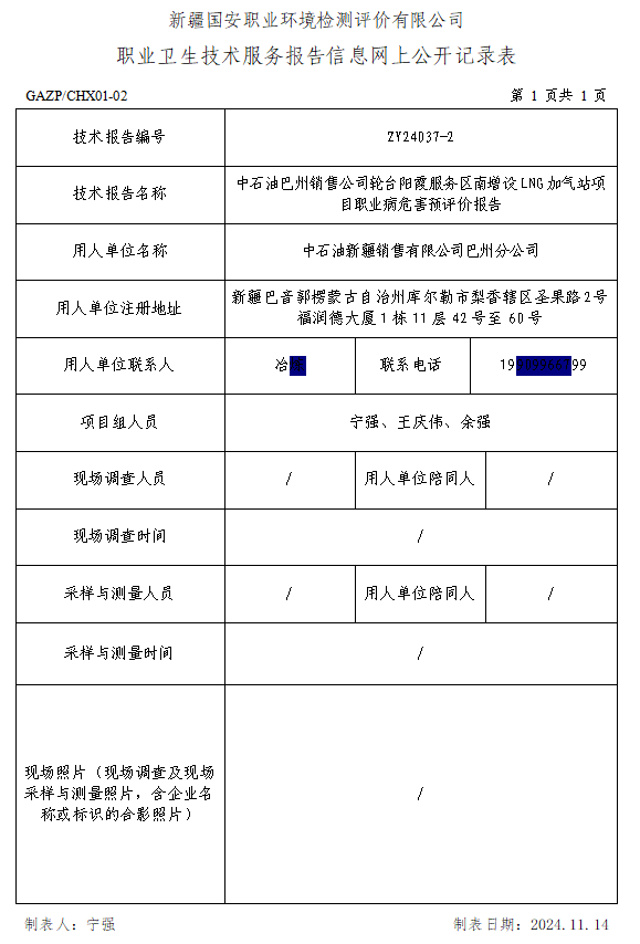中石油巴州销售公司轮台阳霞服务区北增设LNG加气站项目职业病危害预评价报告