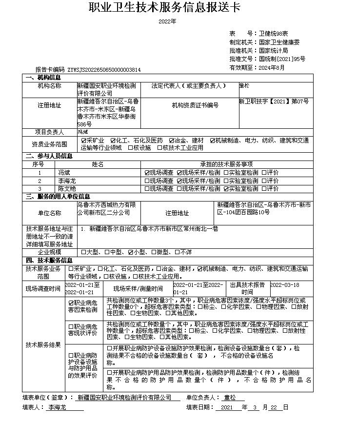 乌鲁木齐西城热力有限公司新市区二分公司职业危害因素检测
