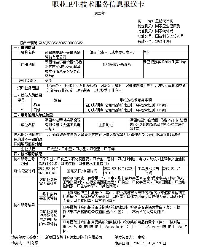 新疆华电苇湖梁新能源有限公司白杨沟风电一场职业病危害因素检测