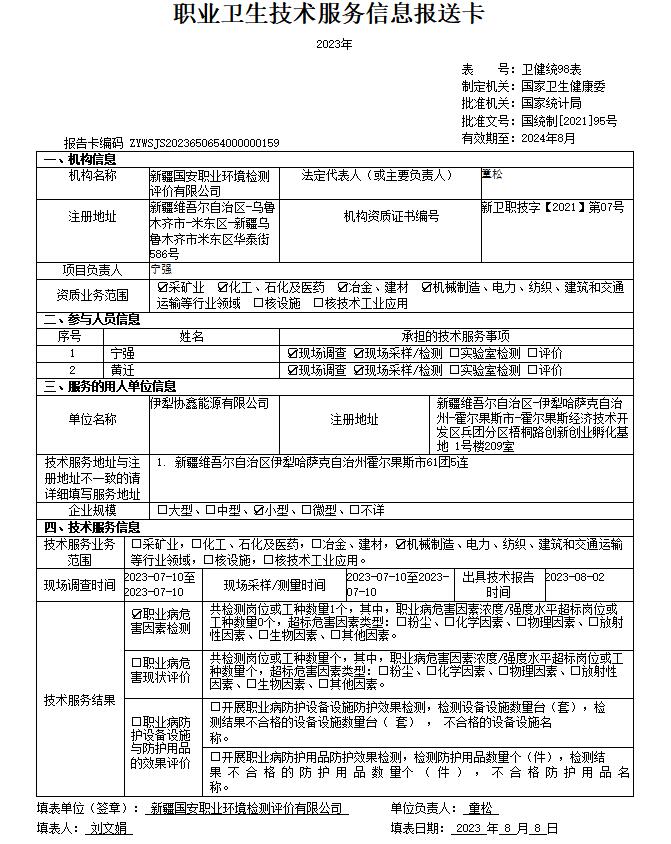 华能新疆木垒新能源有限公司职业病危害因素检测